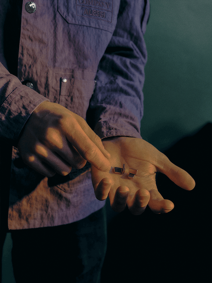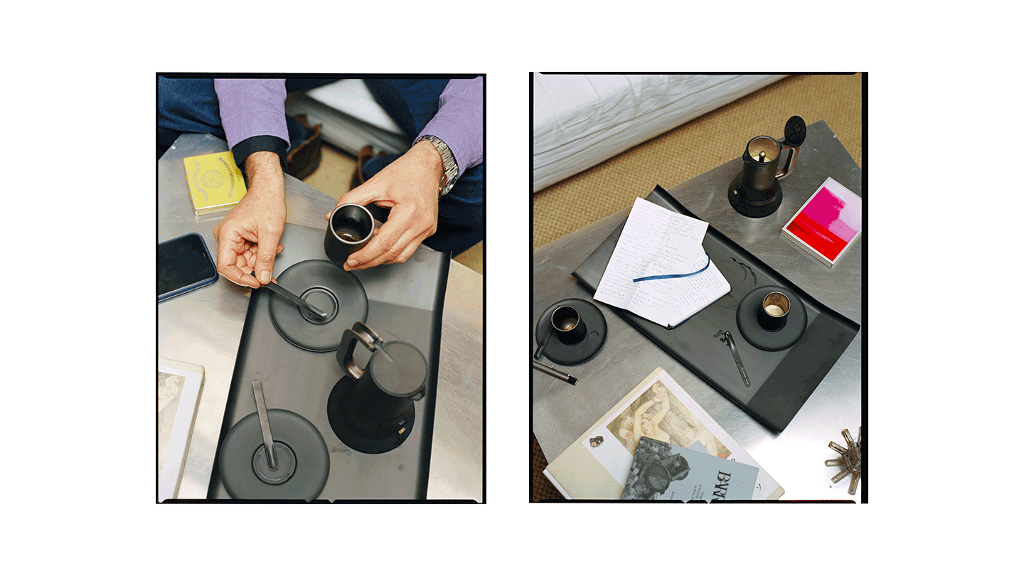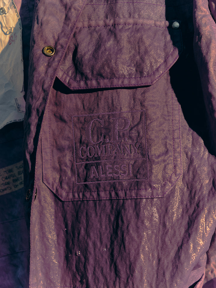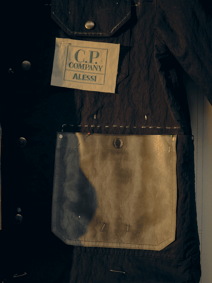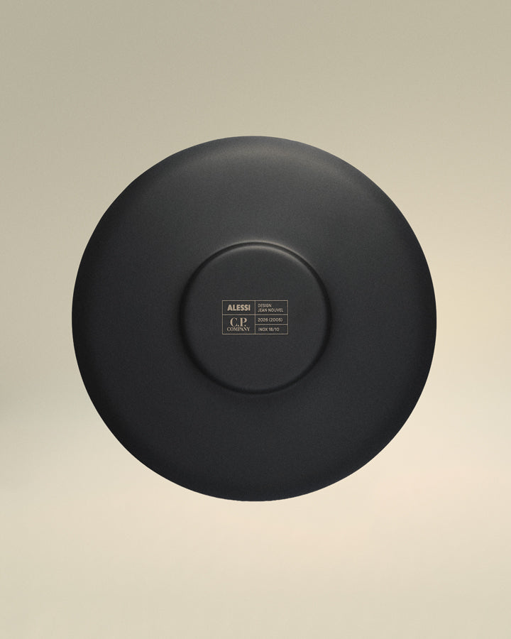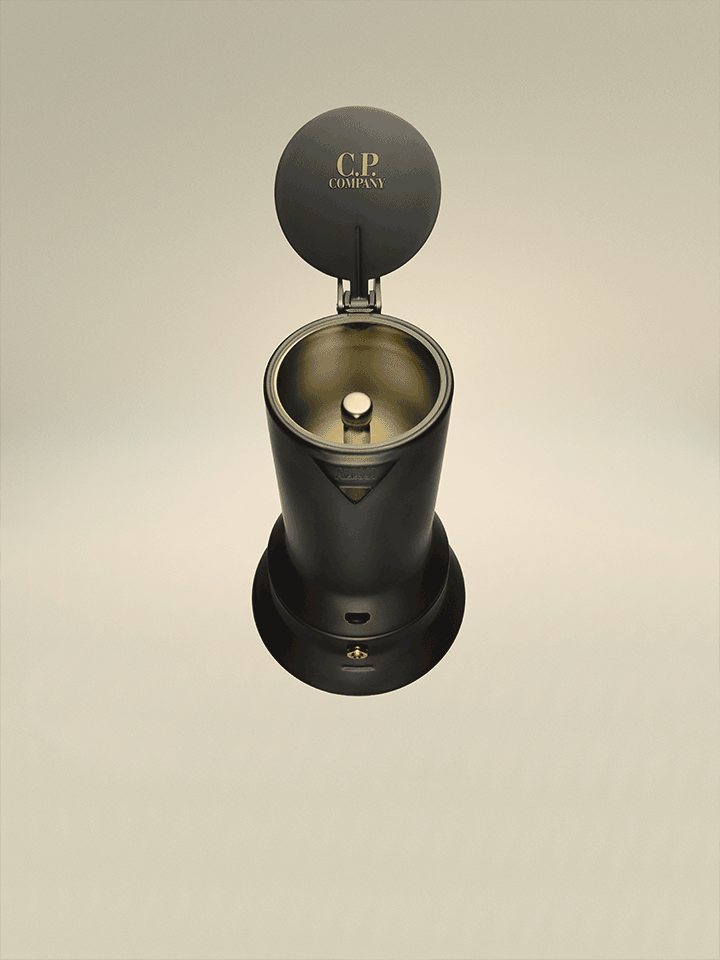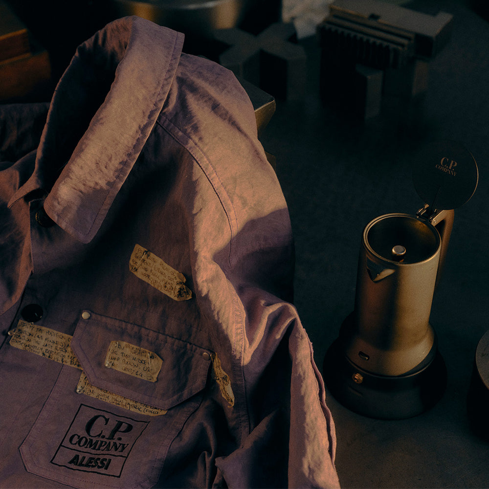 CARLO GASPARINI: We chose Richard Sapper’s coffee maker and selected Enzo Mari’s tray and Jean Nouvel’s cups from the archive because they share the same aesthetic frequency as C.P. Company: authentic, technical forms rooted in our culture of metalworking. Nouvel’s cups also have a double wall, which recalls the thermal insulation of your garments. For the surface treatment, we wanted the DNA of C.P. Company. We conducted a lot of tests, experimenting with different technologies before arriving at a surface that feels alive, not perfect, but as you say, authentic.