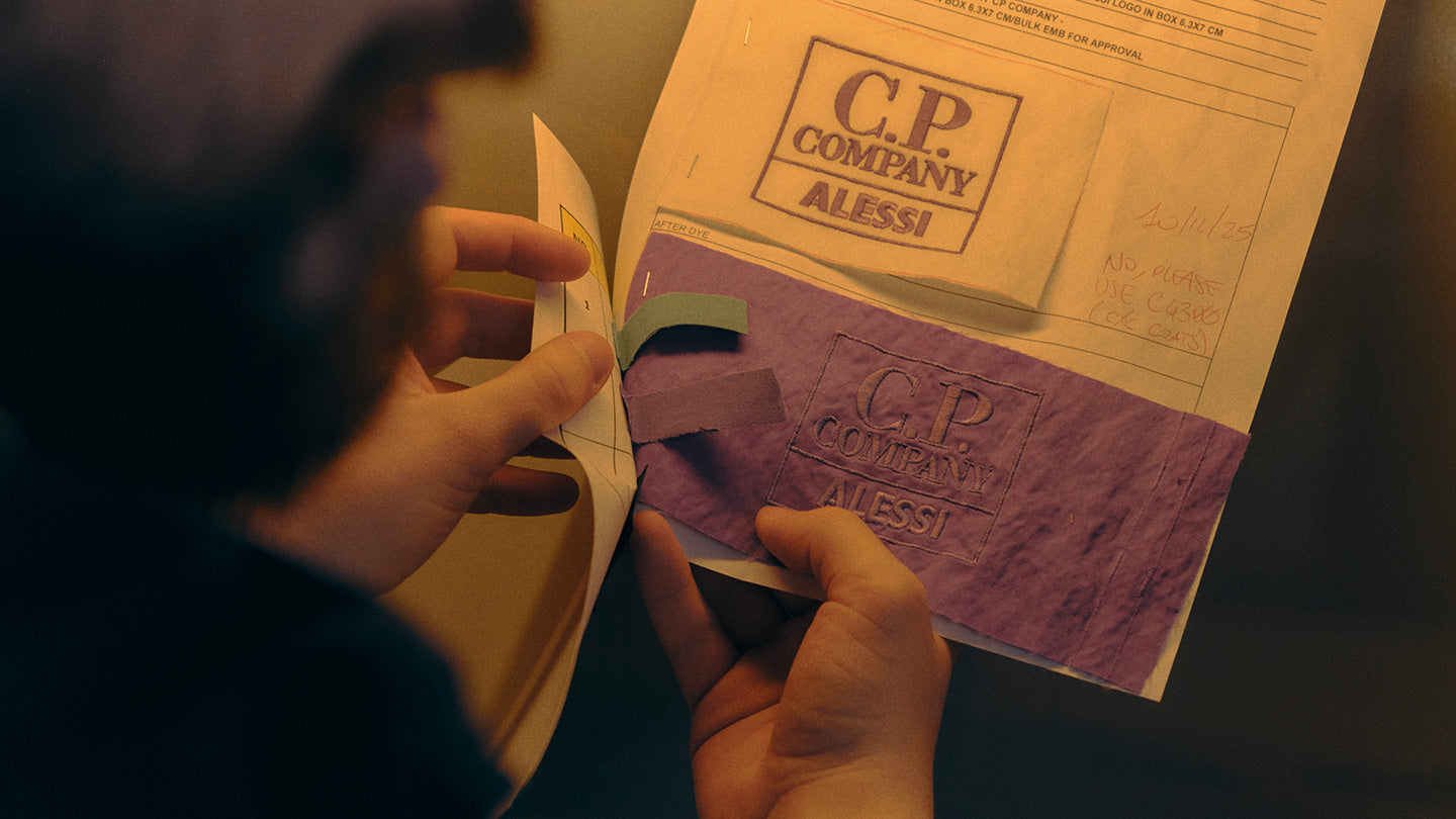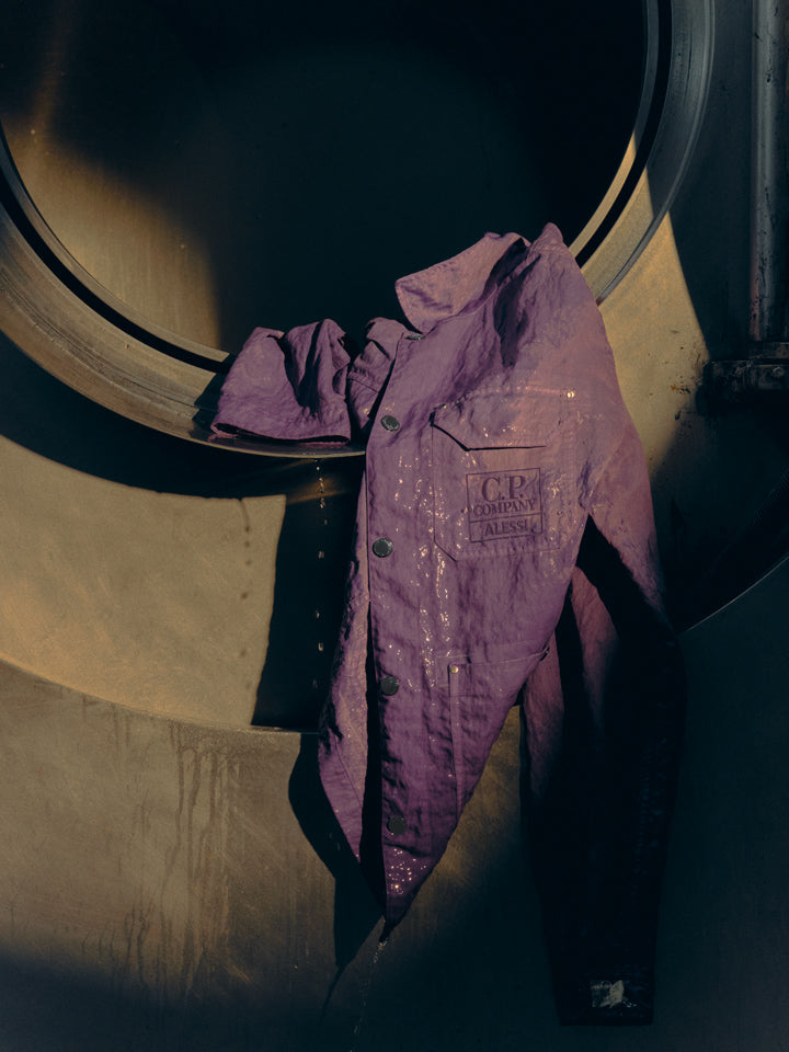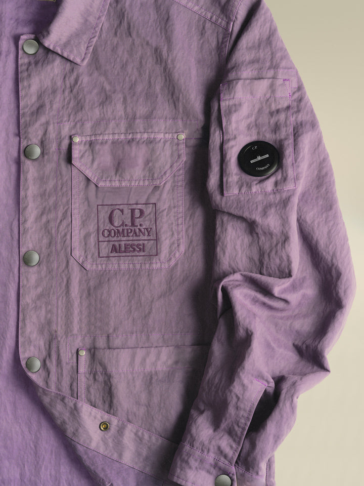 The mutual tribute continues in the shades chosen for the Overshirt: Total Eclipse—a very intense blue, almost black—is derived from the C.P. Company palette, while Deep Lavender and Malachite Green are colors sampled directly from the Alessi Workshop. On the products within the collection, both brands are featured with graphics that recall the title blocks of technical drawings and factory culture. It is a collaboration that unfolds the identity and deepest values of two excellences of Italian design.
