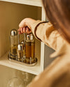 The original design of the 5070 cruet set called for two central pins welded to the base, on which oil and vinegar containers equipped with a central groove were to fit. The idea was shelved because it was not possible to make such bottles from glass. The pins thus passed on the outside, holding the bottles on their sides. Conceived for professional use - in the early 1970s, Alessi specialized in hotel supplies - the cruet set immediately stood out for its creator's unmistakable design language and quickly conquered the domestic sphere as well.