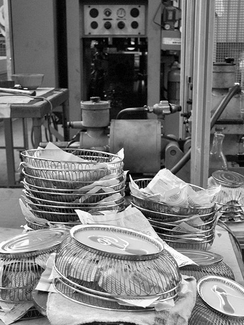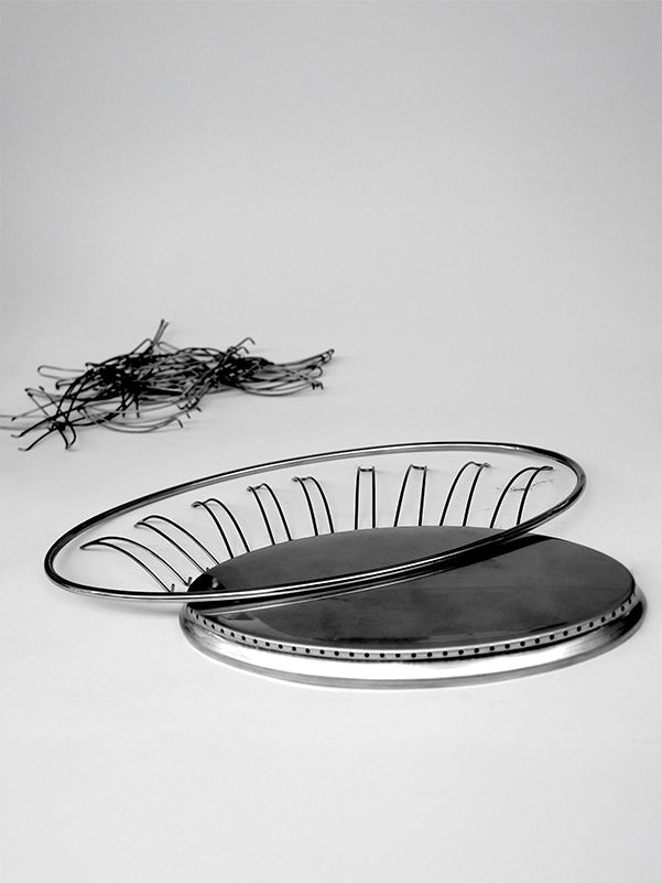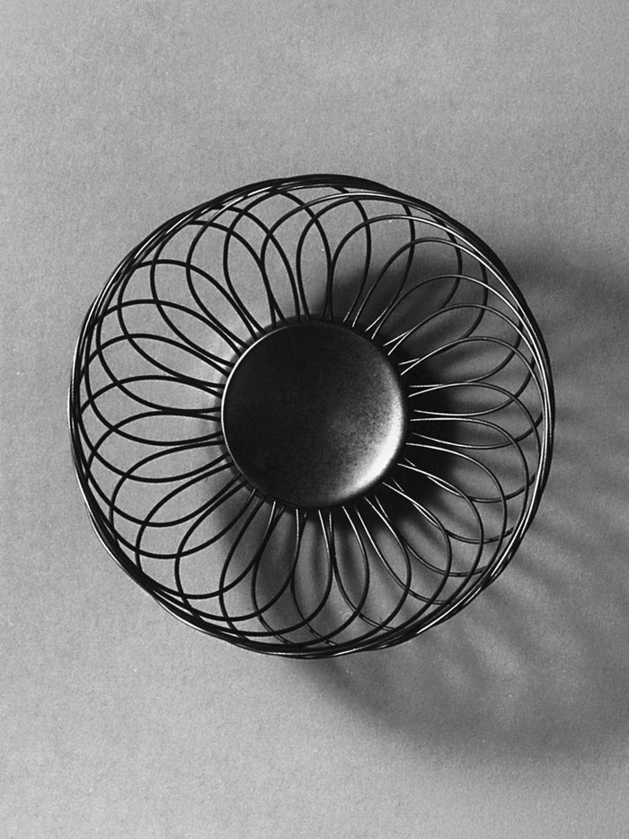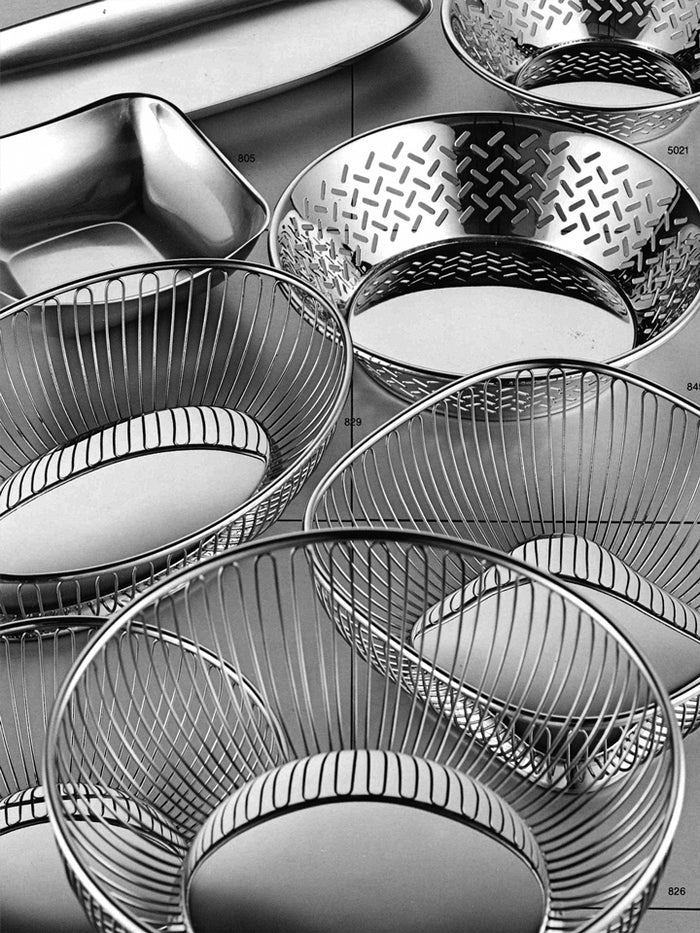 In the late 1940s, after the wartime hiatus, the design activities of the Alessi Technical Office resumed. The research in wire products led in 1948 to the production of the 826 round basket, followed in 1955 by the oval version and in 1966 by the square version. The simplicity of execution of these baskets is matched by a refined formal result. Their success is remarkable: they offer a more modern and dynamic alternative to the still popular silver baskets, suitable for both curated and informal tables, anticipating the contemporary taste for refined minimalism.