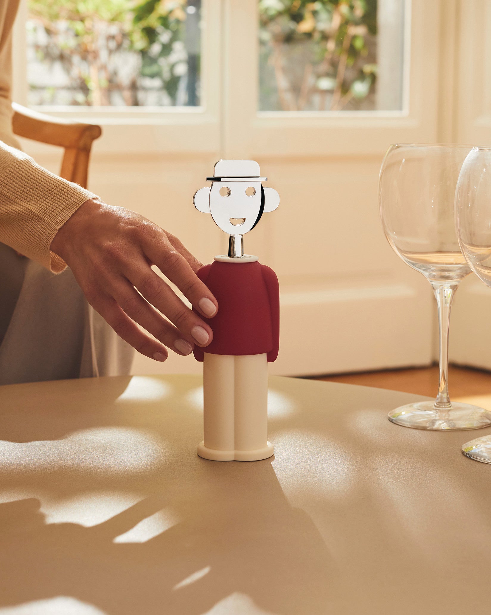 "The corkscrew object has movement and sound. During use it delivers a performance. It represents a character, hence its human figure." With these words, Alessandro Mendini explained the anthropomorphic inspiration of Anna G. and Alessandro M., two "corkscrew friends" to whom the author has given distinct characters: "Alexander M. is a bit funny, he twists in on himself [...] he is vain, he likes to change clothes often, depending on the occasion: for parties, at work, at the theater, in costume, traveling, in the country, for ceremonies..." A transforming corkscrew, over the years always in new and original guise.