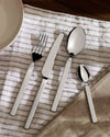 Dry, in production since 1982, was the first and for several years the only Alessi cutlery model. "Items of cutlery are held in the hand for very little time" - Achille Castiglioni said - "they are not work tools that need to have the shape of the hand." The ergonomics in Dry cutlery is not in the design of the handle, but in the end piece that must fit the type of food for which it is intended. They have wide and long prongs, capable scoops, and elongated blades, to which are added the characteristic ingot shape of the handles and the thin neck joint, which is a technically difficult detail to execute.