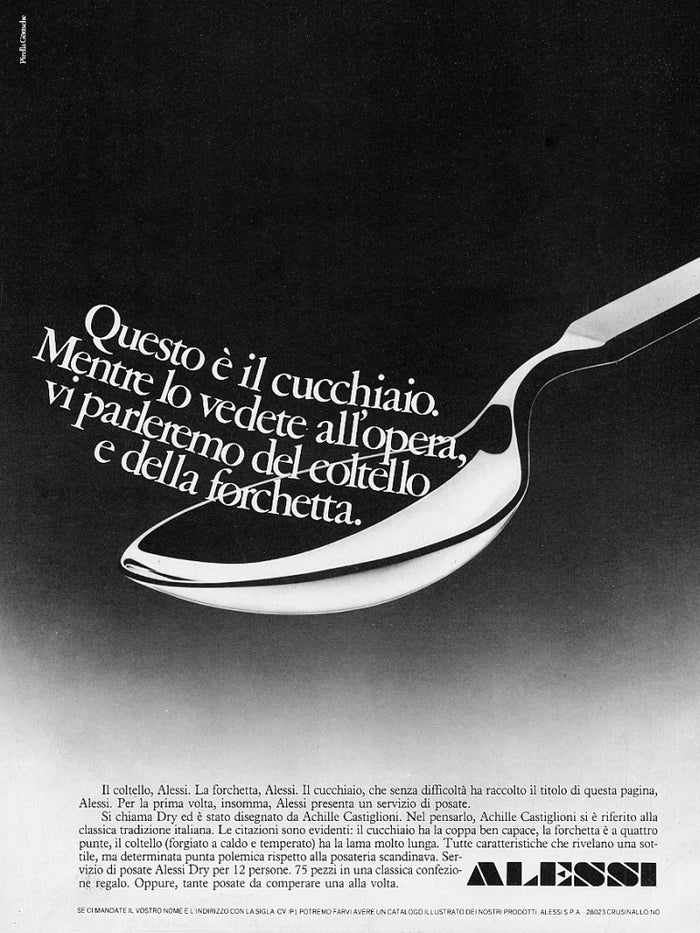 For Achille Castiglioni objects had to fulfill two essential requirements: they should offer practical solutions to the small problems arising while “being at the table,” possibly with intelligent functional innovation, and they should also satisfy the public’s taste, for example, for the finish of metal.