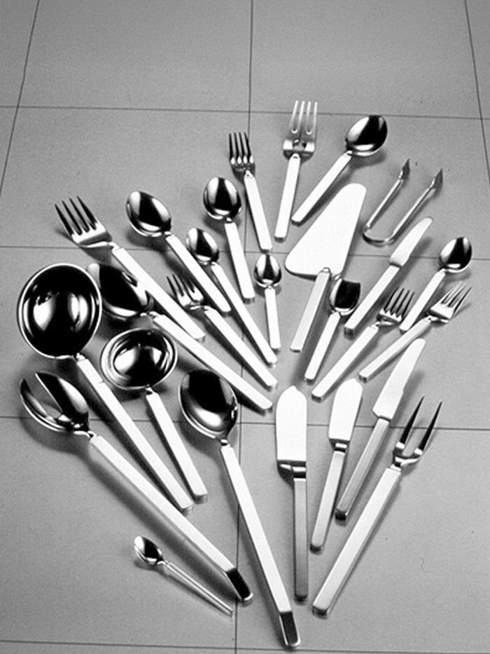 Dry, in production since 1982, was the first and for several years the only Alessi cutlery model. "Items of cutlery are held in the hand for very little time" - Achille Castiglioni said - "they are not work tools that need to have the shape of the hand." The ergonomics in Dry cutlery is not in the design of the handle, but in the end piece that must fit the type of food for which it is intended. They have wide and long prongs, capable scoops, and elongated blades, to which are added the characteristic ingot shape of the handles and the thin neck joint, which is a technically difficult detail to execute.