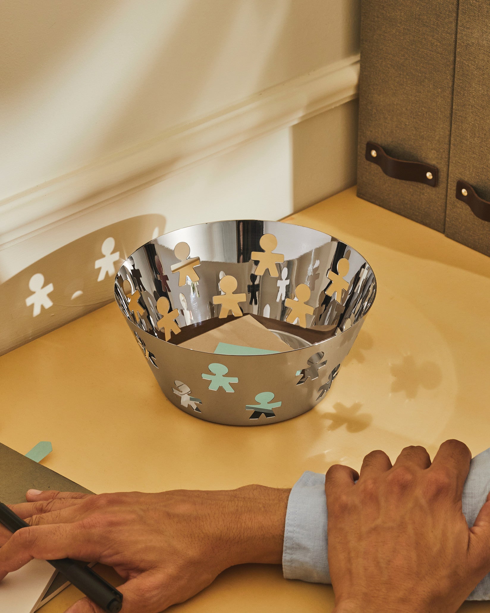A symbol of the strand of playful design based on the use of affective codes, an excellent example of being rooted in childhood memory, the little man motif debuted by decorating perhaps the most traditional object for Alessi, the tray, and then expanded into the catalog. The choice of the fretwork design was a hard-fought one: from a variety of possible anthropomorphic outlines, the final shape emerged thanks in part to the inadvertent advice of Giovannoni's trusted stationer who, when confronted with three alternatives, clearly pointed to the one that would later become the iconic little man.