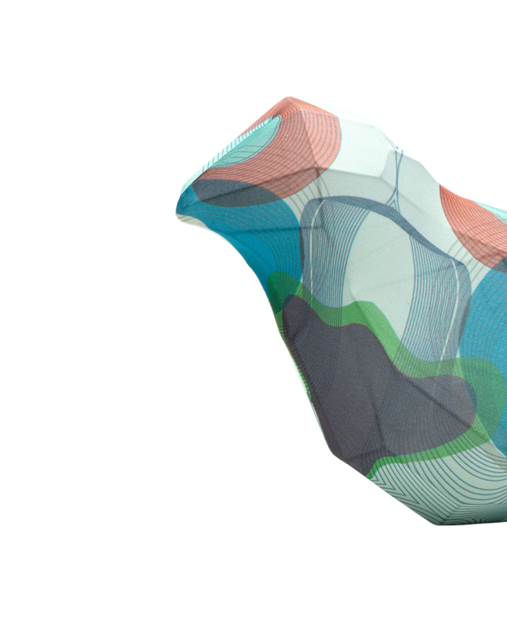 Lamp in decorated elastic fabric, with structure in steel. Accessory: white elastic fabric. LED light, 1 Watt and 12 Volt.