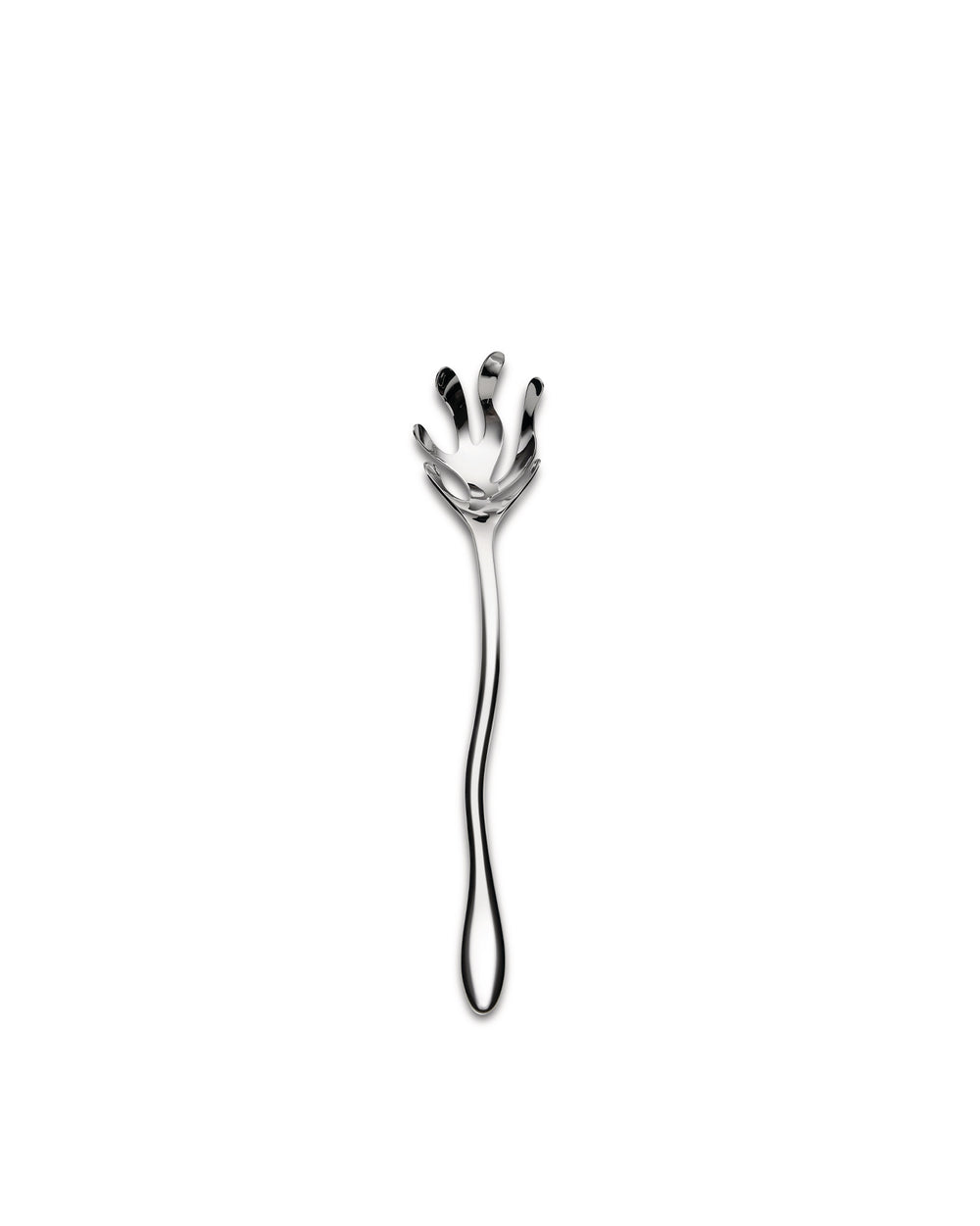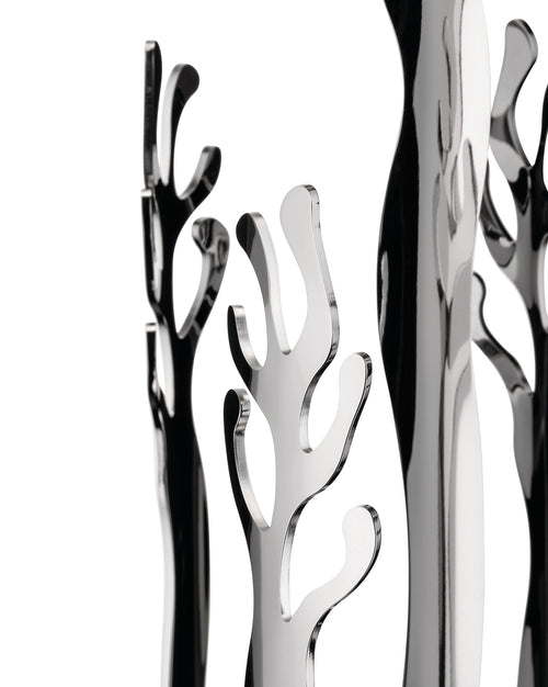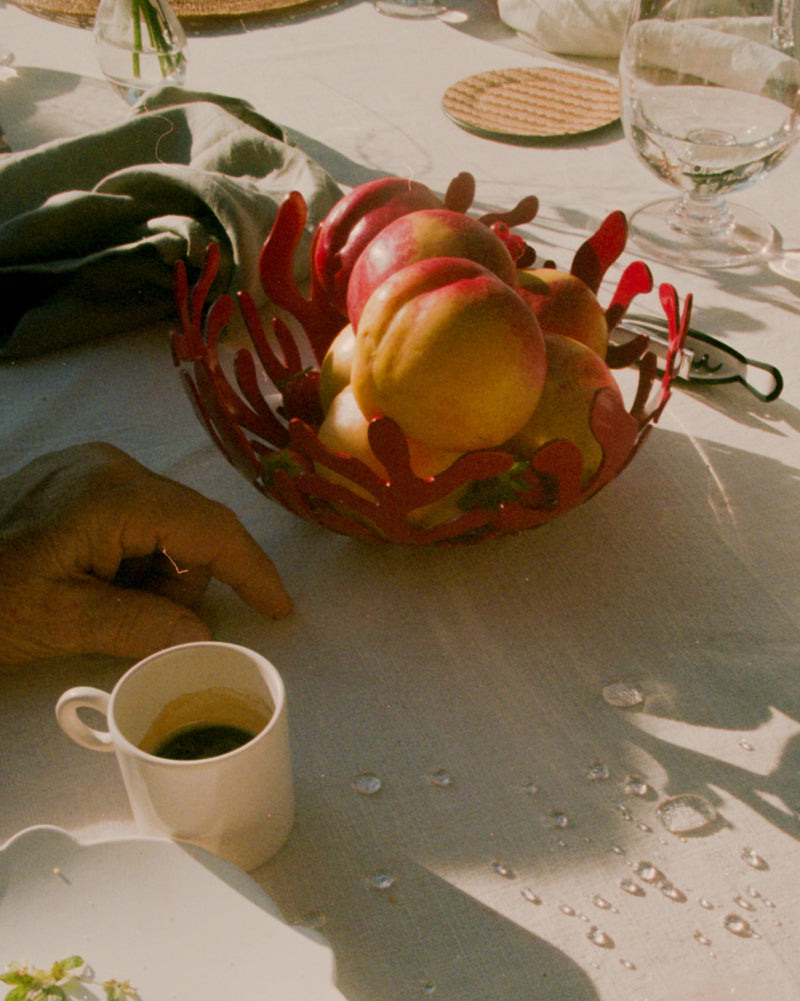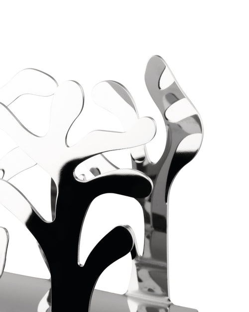 The Mediterraneo decor was born in 2004 during Lightness of Steel, a design workshop curated for Alessi by Laura Polinoro (LPWK). Participants were asked to reinterpret steel in objects that did not communicate physical solidity, and to draw on imagery related to the biological, organic and natural world, which has always been a powerful evocative force when used in objects. Sheet metal fretwork emerged as an ideal way to infuse steel with lightness. Emma Silvestris responded to this challenge with a bold oxymoron, transferring to metal the delicateness of organic coral.