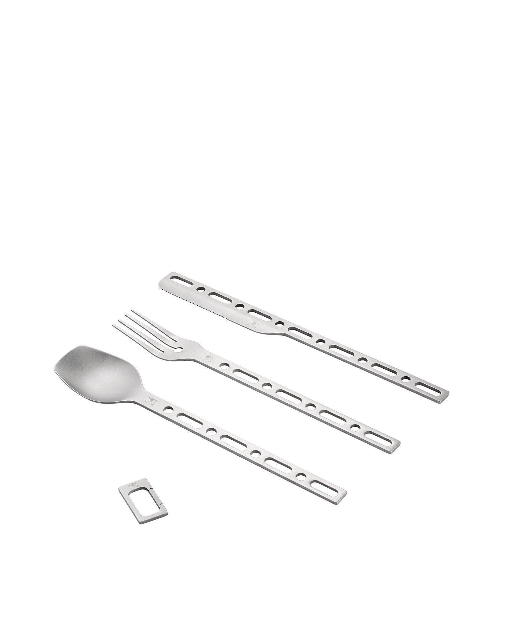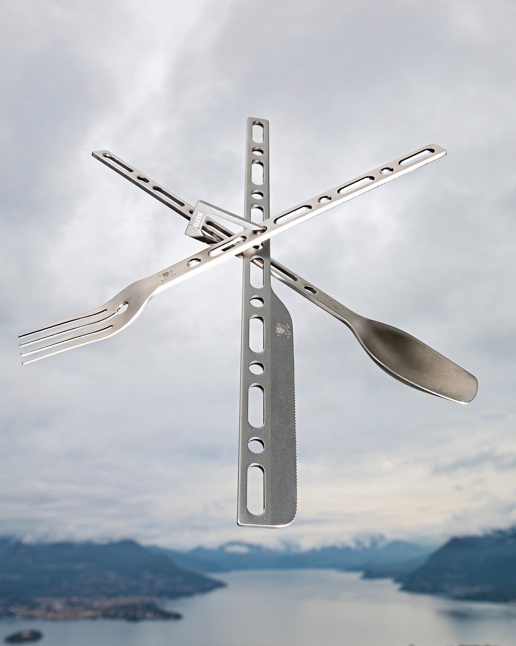 Cutlery set: spoon, fork, knife with carabiner in 18/10 stainless steel. Limited edition of 999 numbered copies and 3 artist's proofs.