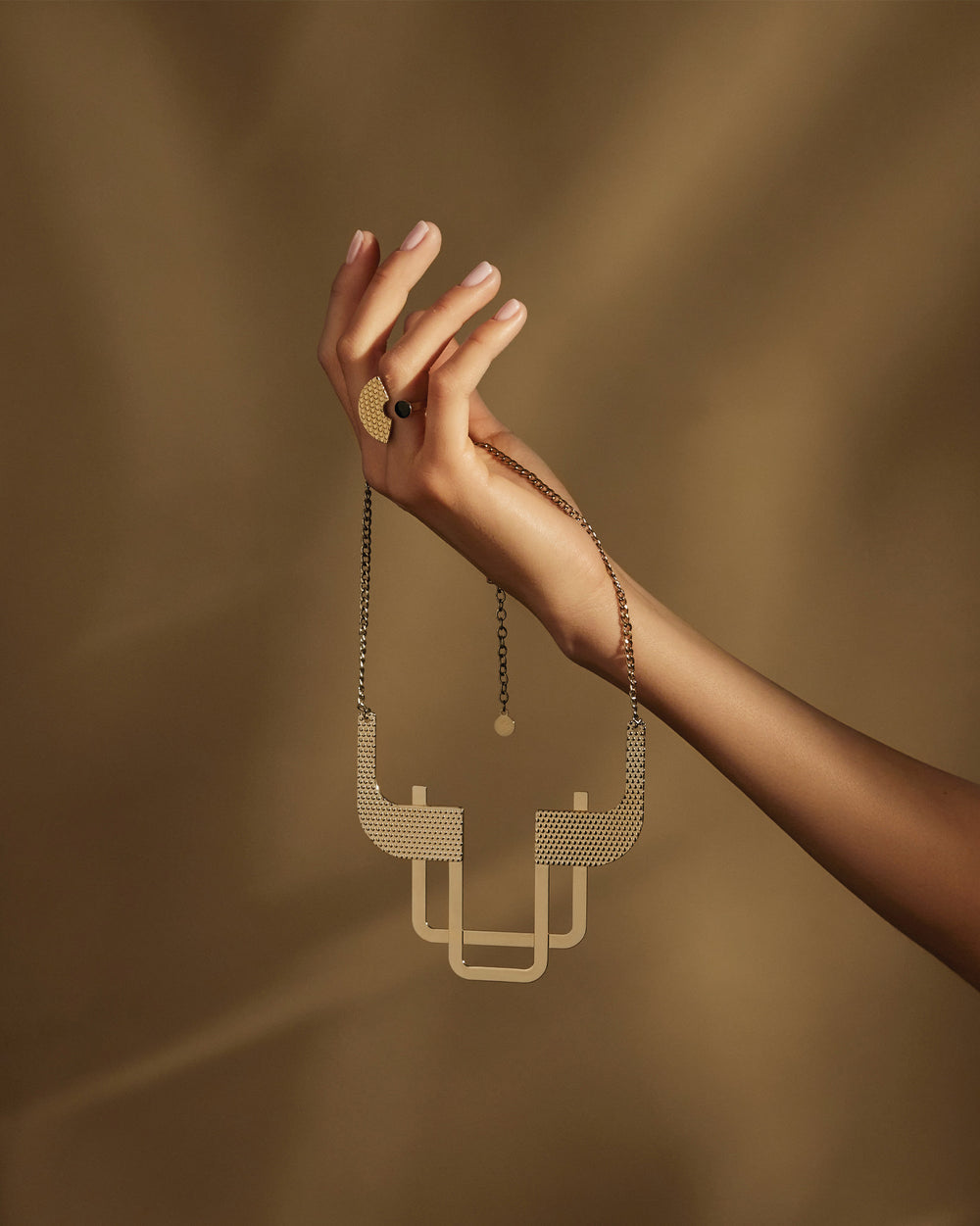 A collection of "workshop jewelry," embellished with refined metal processing. Gold and black, ancestral and industrial, figurative and abstract: the Venusia collection is a completely original interpretation of archetypal jewelry forms.